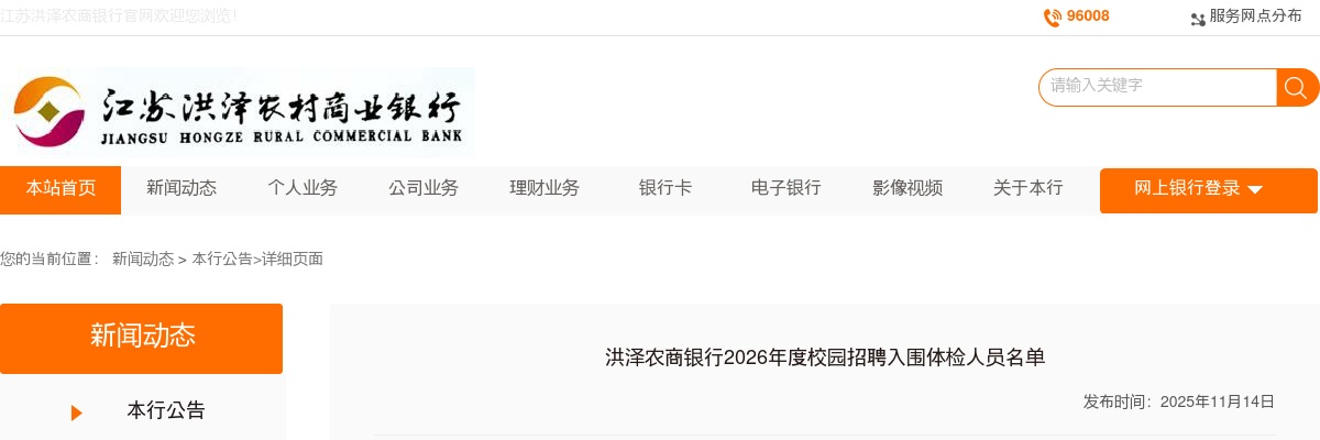 【2026江苏淮安市洪泽农商银行校园招聘入围体检人员名单 进入阅读模式】相关岗位: